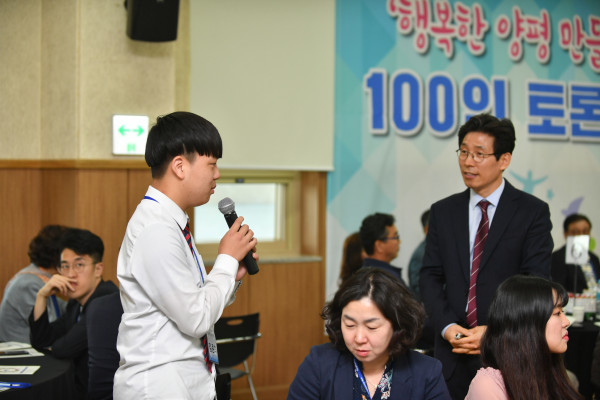 경기 양평군은 최근 강상면 복지회관에서 군민과 함께하는 '행복한 양평 만들기' 100인 토론회를 열었다. 이날 토론회는 각계각층 군민들이 10명씩 10개 분임으로 나눠 다양한 의견을 공유했다. 사진은 토론회에 참석한 학생이 의견을 말하는 모습. (사진제공=양평군청)