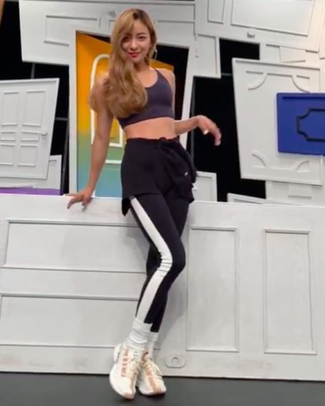 루나는 몸에 밀착되는 레깅스로 드러난 늘씬한 각선미를 자랑한다. 또 브라톱 아래 보이는 루나의 탄탄한 복근은 감탄을 자아낸다.