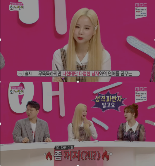 솔지는 12일 방송된 MBC ‘호구의 연애’에서 “다른 여자에게 무뚝뚝하지만 나에게만 다정한 남자와 연애를 꿈꾸고 있다”라고 밝혔다.