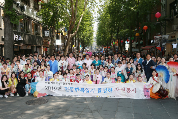 14일 구의회에 따르면 이날 캠페인에서는 종로구의회 의원들을 비롯해 자원봉사 활동을 위해 참여한 청소년 200여명이 모두 전통한복을 입고 북인사마당에 모여 전통공연을 관람하고 행진을 실시하는 등 한복과 우리 전통문화의 우수성을 국내외 관광객과 시민들에게 알렸다.