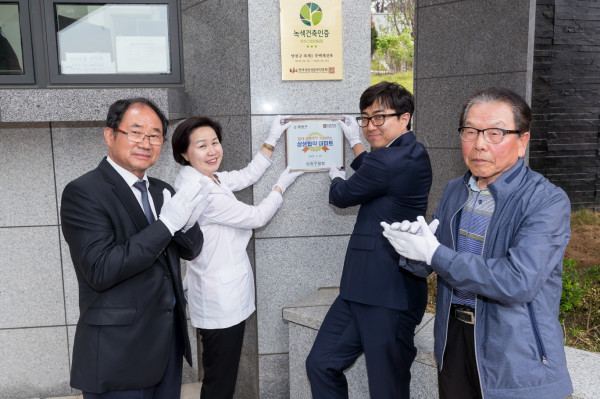 서울 양천구가 13일 목동롯데캐슬마에스트로 아파트와 ‘함께 존중하고 배려하는 상생의 공동체문화 조성 협약’을 맺고 ‘상생 아파트 현판식’을 개최했다. 사진은 상생아파트현판식에 참석한 김수영 구청장(왼쪽 두 번째)이 현판식 후 기념촬영을 하고 있는 모습. (사진제공=양천구청)