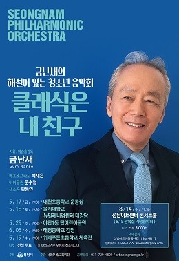 음악회 일정은 ▲5월 17일 오후 7시 상대원2동 대원초등학교 ▲5월 18일 오후 7시 30분 을지대학교(성남캠퍼스) ▲5월 29일 오후 7시 야탑1동 탑 어린이공원 ▲6월 5일 수요일 오후 7시 30분 태평중학교 강당 ▲6월 19일 위례 푸른초등학교 체육관 ▲8월 14일 오후 7시 30분 성남아트센터 콘서트홀 군이다.