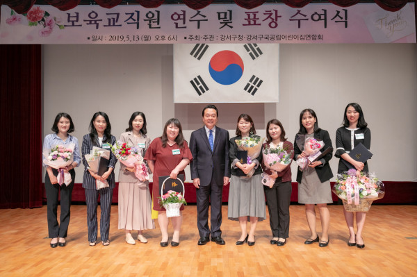 서울 강서구가 13일 강서구민회관에서 보육교사 600여명이 참석한 가운데 ‘국공립 어린이집 우수보육교사 표창장 수여식’을 개최했다. 사진은 이날 표창장 수여 후 노현송 구청장(가운데)과 표창 수여자들이 기념촬영을 하는 모습. (사진제공=강서구청)