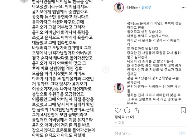 이어 "중요한 건 사람들이 후원금 다시 돌려받고 싶다는데 나와서 왜 조사를 안 받으시는지 왜 신한은행 통장 계좌 전체 내역 공개 안 하시는지 왜 지상의 빛 주소가 경호업체랑 같은 주소였는지 경호업체랑은 무슨 관계인지 본인이 말하는 사비라는 건 어떤 사비를 말하는 건지 그리고 아빠한테 맞은 후 그 후로 신변보호 목적 개인 경호원 후원금을 받았던 건지 증언이 다 끝났음에도 불구하고 아빠가 집으로 돌아가자고 했는데도 무슨 목적으로 안 돌아가고 한국에 기어코 남아있었는지?? 그렇게 목숨이 위험하시다는 분이 왜 한국에 기어코 남아있으려고 했던 건지 언제까지 동문서답만 하고 있을 건지"라고 덧붙였다.