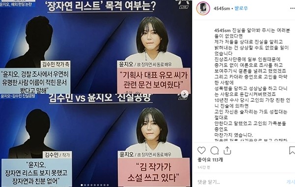 김수민 작가는 지난 5월 14일 자신의 인스타그램에 "윤지오씨 신한은행 계좌 해명해주시고 한국 와서 조사받아주세요. 증언자로서의 사명도 중요하지만 한국인으로서 피고소인 조사도 성실히 받을 의무가 있는 겁니다"라며 귀국을 촉구한 것.