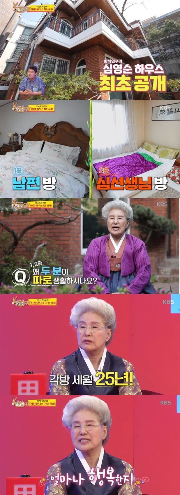 또한 심영순은 MC들의 질문에 “각방 생활을 한 지 25년이 나 됐다”고 밝혔다. 심영순은 각방 생활에 대해 “얼마나 행복한지 모른다”며 웃었다. 그는 “아침이 되면 남편이 기다려진다”고 덧붙였다.