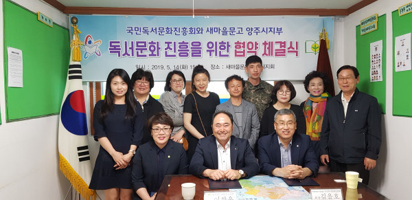 경기 양주시에 소재한 새마을문고 양주시지부는 14일 새마을운동양주시지회 회의실에서 사단법인 국민독서문화진흥회와 독서를 통한 행복한 문화 나눔과 관련된 공동사업 업무협약을 체계했다. 사진은 협약식에 참여한 관계자들이 기념촬영을 하는 모습. (사진제공=양주시청)
