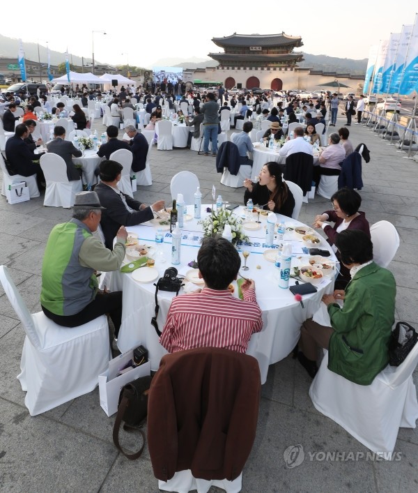 14일 오후 광화문광장에서 열린 '미세먼지 속의 다이닝'행사에서 참석자들이 만찬을 즐기고 있다. 이번 행사에서는 시민들이 광장에서 만찬을 즐기는 동안의 미세먼지 농도 변화를 살펴보며 미세먼지의 경각심을 재확인했다.