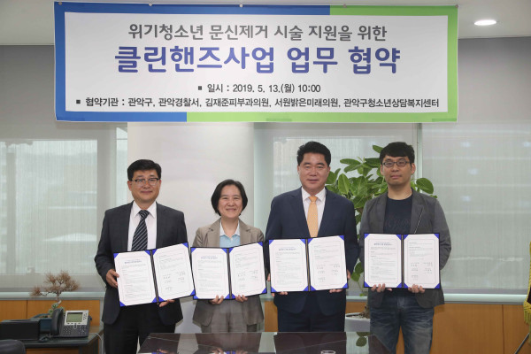 서울 관악구가 최근 지역 유관기관들과 위기청소년 문신제거 시술을 지원하는 '클린핸즈' 사업의 운영을 위한 업무협약을 체결했다. 사진은 협약식에 참석한 박준희 구청장(오른쪽에서 두 번째)과 관계자들이 협약서를 들고 기념촬영을 하는 모습. (사진제공=관악구청)