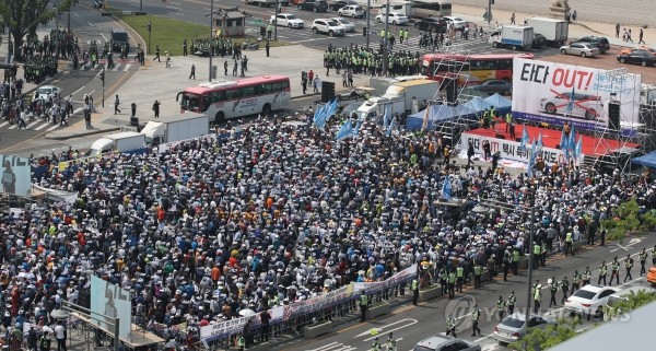서울개인택시운송사업조합 소속 택시기사들이 15일 오후 서울 종로구 광화문 광장에서 '타다 퇴출' 집회를 하고 있다.