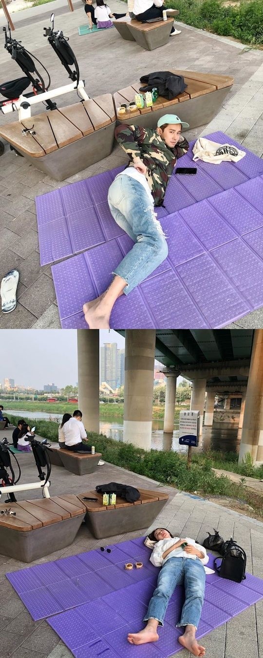 김상혁과 송다예는 돗자리에 누워서 포즈를 취하고 있다. 편안해 보이는 두 사람의 모습에 관심이 모아졌다.
