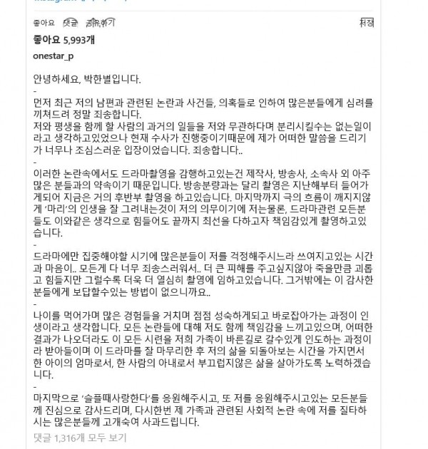그는 "모든 논란에 대해 저도 함께 책임감을 느끼고 있으며, 어떠한 결과가 나오더라도 이 모든 시련을 저희 가족이 바른길로 갈 수 있게 인도하는 과정이라 받아들이겠다"며 "이 드라마를 잘 마무리한 후 저의 삶을 되돌아보는 시간을 가지면서 한 아이의 엄마로서, 한 사람의 아내로서 부끄럽지 않은 삶을 살아가도록 노력하겠다"고 전했다.