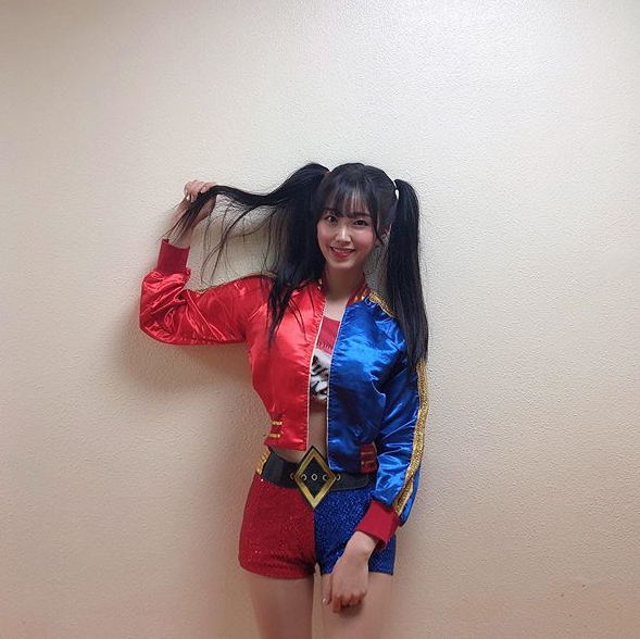 사진 속 안지현은 할리퀸의 상징이라고 할 수 있는 양갈래 머리를 한 뒤 하늘색과 빨간색이 반반 섞인 자켓, 핫팬츠를 입고 완벽한 싱크로율을 뽐내고 있다.
