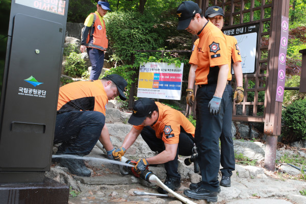 서울 강북소방서가 15일 오후 2시 북한산국립공원 백운대탐방지원센터 위쪽 능선에서 산불 초동진화 대응능력 강화를 위한 '유관기관 합동 산불진압 훈련'을 실시했다. 사진은 고압호스 장비 사용 훈련을 하고 있는 소방대원들의 모습. (사진제공=강북소방서)