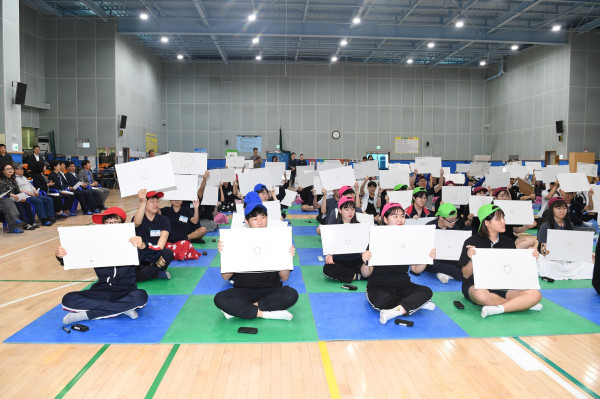 민주평화통일자문회의 경기 하남시협의회는 청소년들에게 올바른 역사관을 정립시키기 위해 15일 유니온타워 다목적체육관에서 ‘2019 청소년 통일 골든벨 하남시대회’를 개최했다. 사진은 골든벨대회에서 학생들이 정답판을 들고 있는 모습. (사진제공=하남시청)