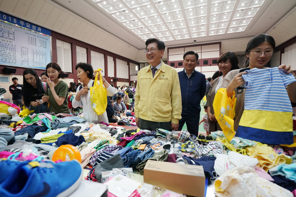 15일 서울 동대문구가 구청 다목적강당과 아트갤러리에서 ‘2019 동대문구청&세클맘 프리마켓’을 개최했다. 사진은 강당에서 열린 프리마켓을 방문한 유덕열 구청장(가운데)이 물건을 살펴보고 있는 모습. (사진제공=동대문구청)