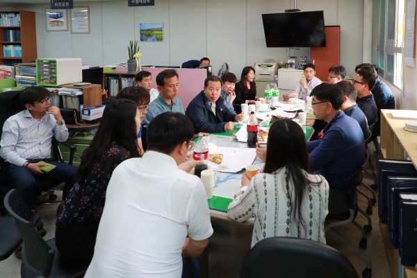 조광한 경기 남양주시장이 지난 14일 지역내 하천을 힐링 공간으로 조성하기 위해 최선을 다하는 시청 생태하천과를 깜짝 방문해 직원들을 격려했다. 사진은 이날 조 시장이 직접 준비한 피자를 직원들과 먹으며 담소를 나누는 모습. (사진제공=남양주시청)