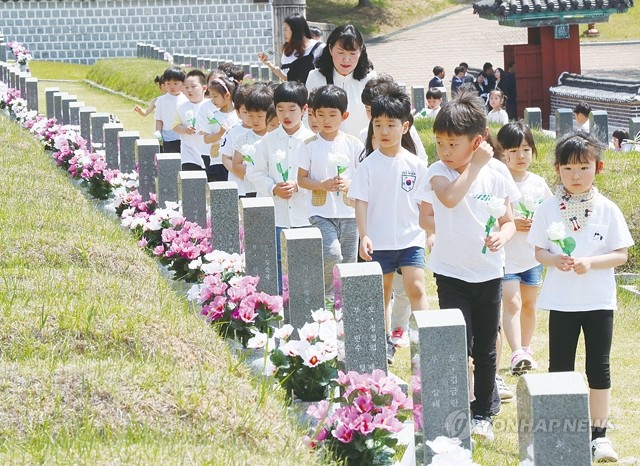 제39주년 5.18 민주화운동 기념식을 이틀 앞둔 16일 오전 광주 북구 국립 5.18 민주묘지를 유치원생들이 꽃을 들고 참배하고 있다.
