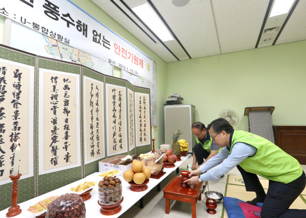 금천구는 지난 15일 오전 10시 구청 지하1층 U-통합상황실에서 ‘2019년 풍수해 재난안전대책본부’ 개소식을 가졌다. 이날 개소식은 현판식이 있은 후 수방대책 종합 보고에 이어 ‘2019년 풍수해 없는 안전 기원제’를 진행했다. 사진은 술잔을 올리고 있는 유성훈 구청장의 모습. (사진제공=금천구청)