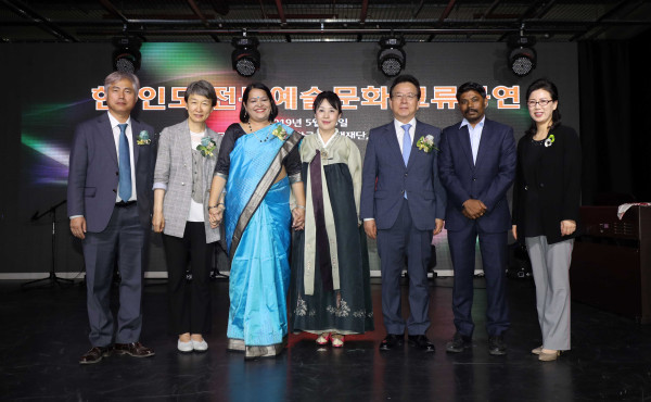 정순균 서울 강남구청장은 최근 강남관광정보센터에서 열린 ‘한국 인도 문화교류 청년사업단 발족식’에 참석했다. 이날 한국 연희단 팔산대공원과 인도 전통 공연이 펼쳐졌다. 사진은 정 구청장(오른쪽 세 번째)과 관계자들이 기념촬영을 하는 모습. (사진제공=강남구청)