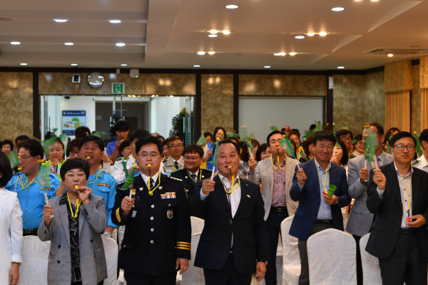 경기 양평군은 최근 평생학습센터 4층 다목적실에서 어린이 교통안전 캠페인의 일환으로 ‘안전한 스쿨존 지키기 발대식’을 개최했다. 사진은 이날 행사에 참석한 정동균 군수 및 관계자들이 호루라기를 불며 안전 캠페인 퍼포먼스를 하는 모습. (사진제공=양평군청)