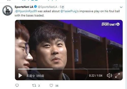 류현진은 4회 푸이그를 유격수 땅볼로 처리했고, 6회 말에는 푸이그의 땅볼 타구를 직접 잡아 1루로 정확하게 송구했다.