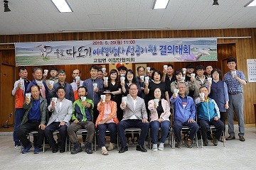 | ▲ ※사진설명: 20일, 고암면 직원과 이장들이 1회용 컵을 사용하지 않기 위해 따오기 로고가 새겨진 머그컵을 들고 따오기야생방사 성공기원 결의대회를 갖고 있다. | ||