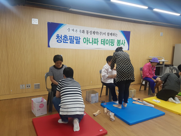 서울 노원구 중계본동 주민센터는 최근 불암도서관에서 (주)동성제약이 후원한 가운데 ‘청춘팔팔 아나파 테이핑 봉사활동’을 실시했다. 이날 아나파 봉사단이 지역 노인 40명의 통증 부위에 근육테이핑을 했다. 사진은 봉사단이 테이핑을 하는 모습. (사진제공=노원구청)