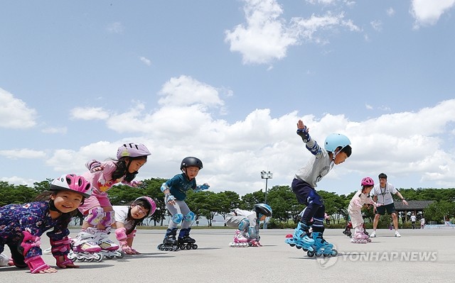 20일 오후 강원 춘천시 의암공원에서 어린이들이 인라인스케이트를 타며 화창한 봄 날씨를 즐기고 있다.