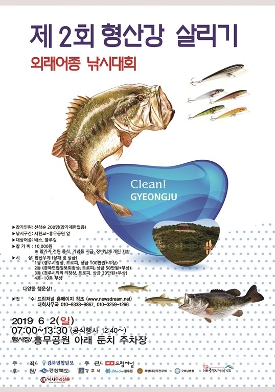 한편 대회사무국은 현재 낚시를 할 정도의 수위가 되지만 가뭄이 계속될 수 있어 최종 오는 30일 자세한 장소를 공지하기로 했다. '제2회 형산강 살리기 외래어종 낚시대회'는 경북연합일보가 주최하고 드림저널이 주관하며, 경북도와 경주시,블루원,해병대경주전우회,굿모닝병원,(사)중앙시장상인회,시민일보,시사우리신문 등이 후원하고 있다.