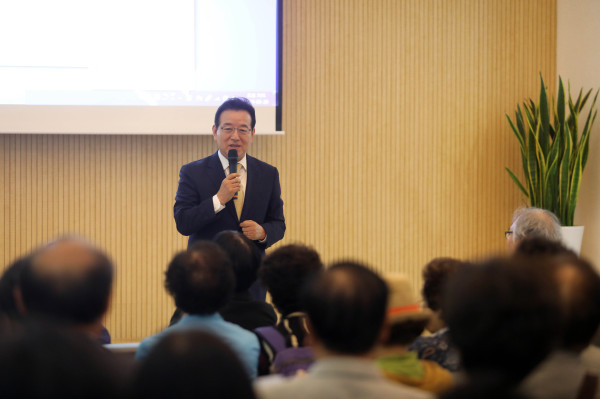 서울 강남구는 20일 구청 로비에서 지역 명소를 널리 알리고자 신병주 교수의 ‘강남구의 상징, 선정릉과 봉은사 찾아가기’ 강연을 개최했다. 사진은 이날 강연에 참석한 정순균 구청장이 강연 시작 전 인사말을 전하고 있는 모습. (사진제공=강남구청)