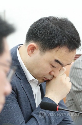 바른미래당 채이배 정책위의장이 21일 국회에서 열린 원내대책회의에서 동료의원들의손학규 대표 비난 발언을 듣고 있다.