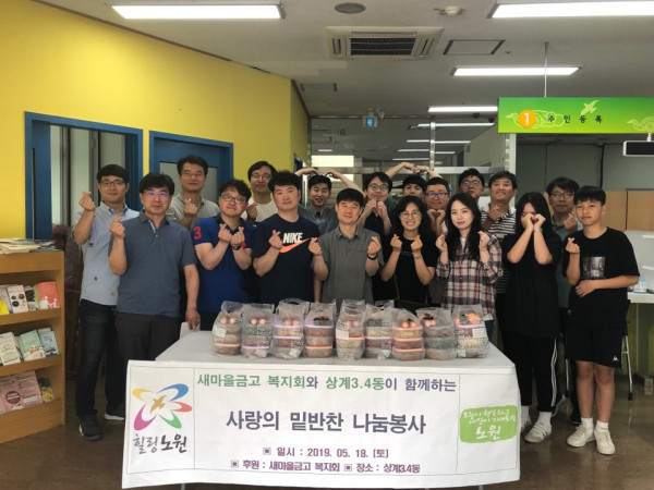 서울 노원구 상계3·4동 주민센터가 최근 새마을금고 복지회 임직원 18명과 함께 어려운 이웃들에게 반찬을 전달하며 안부를 확인하기 위해 ‘사랑의 밑반찬 나눔봉사’ 활동을 실시했다. 사진은 봉사활동 참가자들이 기념촬영을 하는 모습. (사진제공=노원구청)