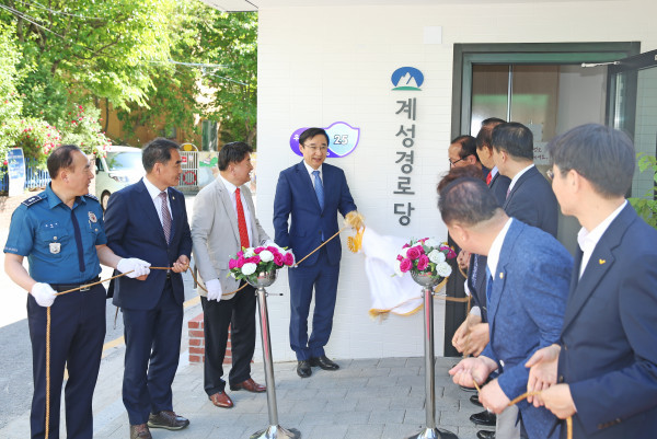 서울 도봉구는 21일 쌍문1동 계성경로당 개관식을 개최했다. 구립계성경로당은 총 5억원의 구 예산을 투입해 연면적 123.48㎡, 지상 1층 규모로 건립됐다. 사진은 이동진 구청장(왼쪽 네 번째)과 관계자들이 현판을 다는 모습. (사진제공=도봉구청)