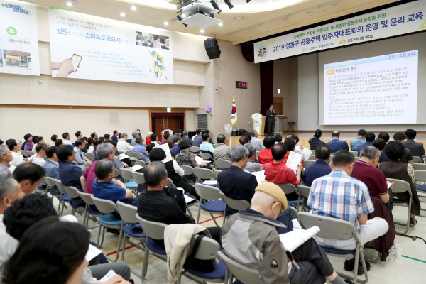 서울 성동구는 21일 구청 3층 대강당에서 공동주택 입주자대표회의 구성원을 대상으로 ‘입주자대표회의 운영 및 윤리교육’을 실시했다. 이번 교육은 대한주택관리사협회에서 추천한 전문강사의 특강으로 진행됐다. 사진은 교육 진행 모습. (사진제공=성동구청)