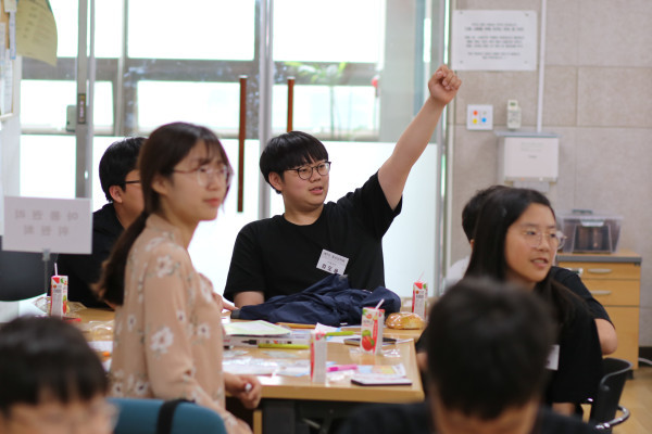 서울 성북구가 최근 마을사회적경제센터에서 '제7기 어린이·청소년의회'를 각각 개원하고 제1차 임시회의를 열어 의장, 부의장 및 분과위원장 선출 등의 활동을 시작했다. 사진은 청소년의회에서 의견을 밝히기 위해 손을 드는 학생의 모습. (사진제공=성북구청)