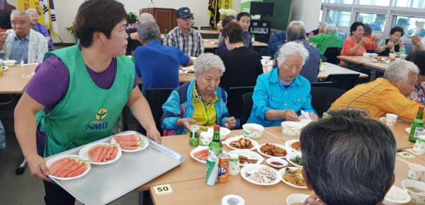 경기 양주시 광적면 새마을부녀회는 21일 분회경로당에서 지역내 노인 100여명이 모인 가운데 따뜻한 점심식사를 대접하며 노인들의 건강을 기원했다. 사진은 이날 경로당에 방문한 부녀회원이 노인들에게 후식으로 수박을 전달하는 모습. (사진제공=양주시청)