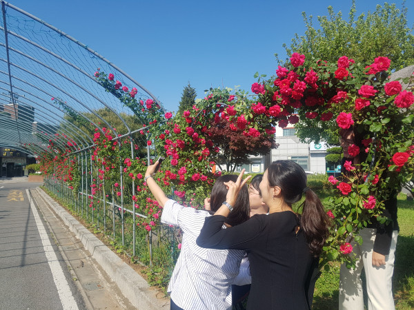 전남 나주시 신포면 주민자치위원회는 최근 '클린나주사업'의 일환으로 면사무소 앞 화단에 장미를 비롯한 여주, 조롱박 등 계절식물을 식재해 색다른 볼거리를 제공하고 있다. 사진은 포토존에서 기념촬영을 하는 내방객들의 모습. (사진제공=나주시청)