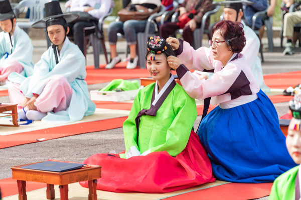 최근 서울 광진구 어린이대공원 열린 무대에서 ‘열아홉, 우리를 뽐내자!’라는 주제로 '제9회 광진구 전통성년례'가 열렸다. 사진은 관계자가 이날 성년자에게 족두리를 씌워주는 모습. (사진제공=광진구청)