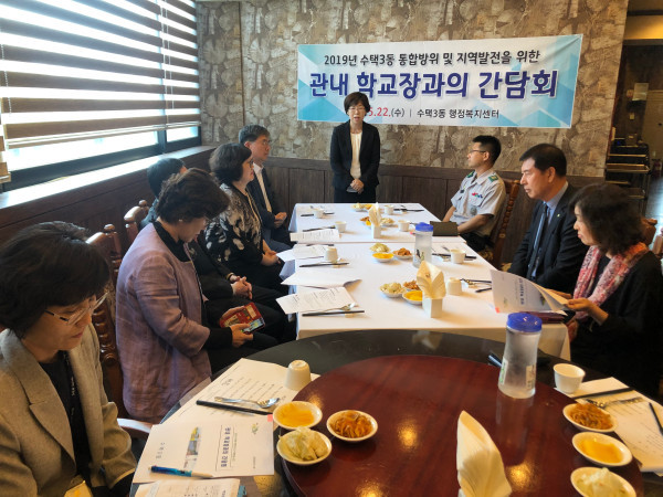경기 구리시 수택3동 행정복지센터는 22일 지역내 초·중·고교 학교장 5명과 주민자치위원장, 예비군 동대장 등이 참석한 가운데 통합 방위 및 지역 발전을 위한 의견 및 애로사항 등을 청취하는 간담회를 열었다. 사진은 회의 진행 모습. (사진제공=구리시청)