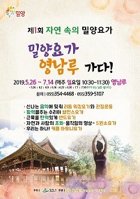 ‘제1회 자연 속의 밀양요가’는 ‘밀양요가 영남루 가다!’라는 슬로건으로 오는 5월 26일 시작하여 7월 14일까지 매주 일요일 오전 10시 30분부터 1시간 동안 8차에 걸쳐 진행된다. 커플‧하모니‧워킹‧댄스요가 등으로 구성해 남녀노소 누구나 서서 할 수 있어, 밀양요가는 쉽고 재미나는 운동이라는 것을 체감할 수 있도록 했다.