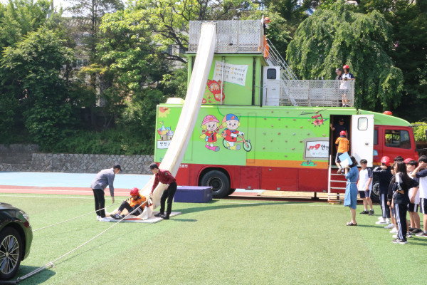 경기 군포소방서는 최근 군포중학교를 찾아가 1학년 학생들을 대상으로 119안전체험교육을 운영했다. 사진은 학생들이 이동안전체험차량을 활용한 하강식 구조대 체험을 하고 있는 모습. (사진제공=군포소방서)