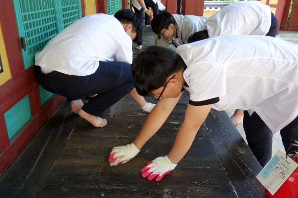 사단법인 인천문화재보존사업단이 최근 인천 강화고등학교 학생 7명을 대상으로 진로직업체험 행사를 열고, 강화 고려고종홍릉 재실의 창호 바르기와 콩땜 체험 등 다양한 현장실습을 실시했다. 사진은 강화 홍릉재실 툇마루에 콩땜체험을 하고있는 학생들의 모습. (사진제공=강화군청)
