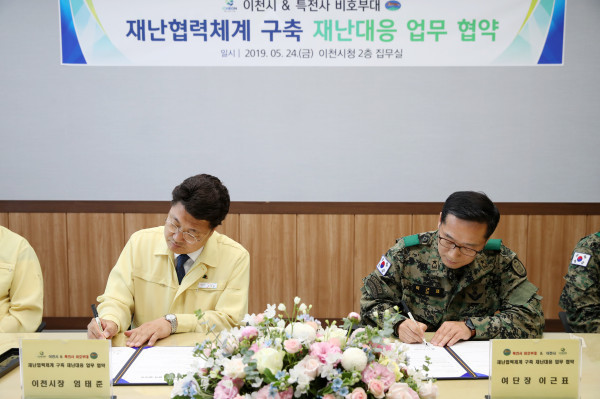 경기 이천시는 지난 24일 재난구조 전문화 부대인 특전사 비호부대와 재난 대응 협력 업무협약을 체결했다. 사진은 엄태준 시장(왼쪽)과 이근표 특전사 비호부대장이 협약서에 서명을 하고 있는 모습. (사진제공=이천시청)