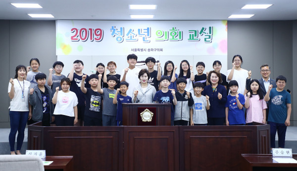 | ▲ 청소년의회교실을 방문한 학생들이 체험을 마치고 기념촬영을 하고 있다. (사진제공=송파구의회) | ||