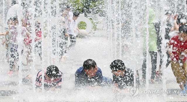 서울 낮 최고기온이 30도까지 올라가는 등 무더운 여름 날씨를 보인 26일 서울 성동구 서울숲에서 어린이들이 분수대로 뛰어들어 더위를 식히고 있다.