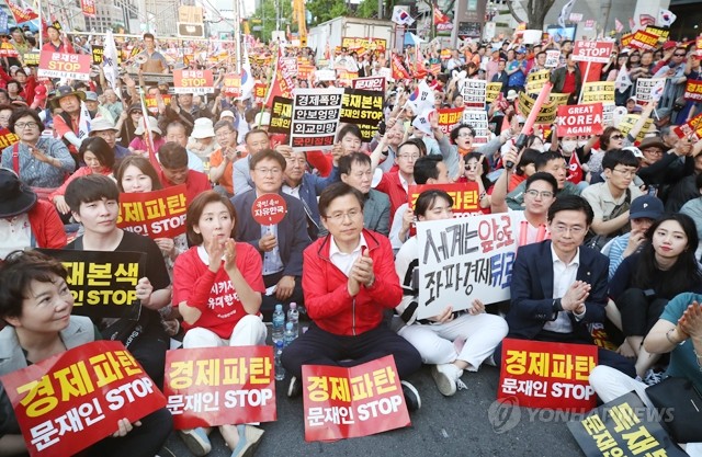 25일 오후 서울 광화문 세종문화회관 앞에서 열린 자유한국당 6번째 ‘문재인 STOP, 국민이 심판합니다’ 장외집회에서 황교안 대표와 나경원 원내대표 등이 박수를 치고 있다.