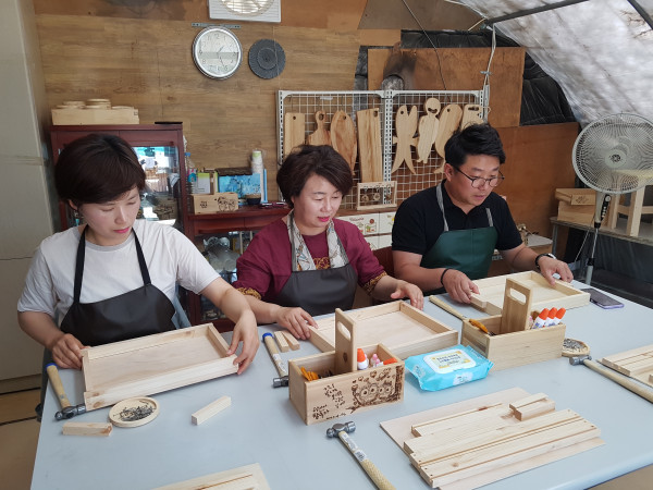 | ▲ 수원시의원들이 목공예 체험을 하고 있다. (사진제공=수원시의회) | ||