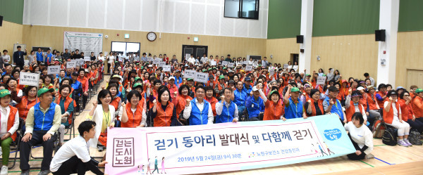 서울 노원구는 최근 구청 보건소 다목적 강당에서 걷기동아리 회원 등 300여명이 참석한 가운데 ‘걷기동아리 발대식’을 개최했다. 이날 발대식은 동아리 및 걷기코스 소개 등으로 진행됐다. 사진은 오승록 구청장과 참석자들이 기념촬영을 하는 모습. (사진제공=노원구청)