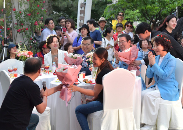 26일 오후 서울 중랑구 묵동 수림대 장미정원에서는 사연공모로 선정된 7가족을 초대해 이야기를 듣는 ‘로즈피크닉 가든 콘서트’가 열렸다. 이날 참가한 부부들은 영상으로 제작된 사연, 남편이 준비한 꽃다발과 깜짝 사랑고백에 감동의 눈물을 보이기도 하며 즐거운 시간을 보냈다. 콘서트에 참여한 류경기 구청장과 박원순 서울시장 부부가 즐거워하고 있는 모습. (사진제공=중랑구청)